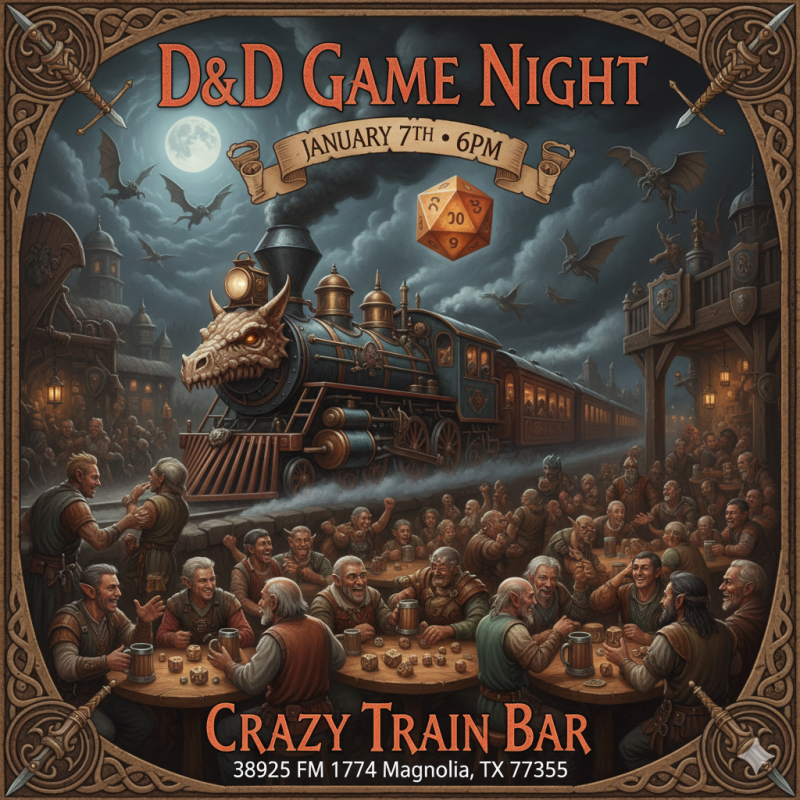 Join us for an evening of adventure, strategy, and storytelling at Crazy Train Bar. Gather a party, roll the dice, and embark on epic quests in a fun and welcoming atmosphere. All experience levels are welcome—whether seasoned adventurers or first-time players.